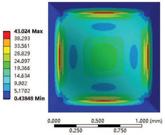 According to the comparison between Figure 8 and Figure 10, it is concluded that the finite element Von-Mises equivalent stress nephogram at the silicon cup bottom is consistent with the basic value of the stress analytical solution Matlab nephogram, and the stress at the midpoint of four side and the central position is the largest. The maximum error of the two methods is within 25%.