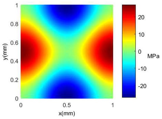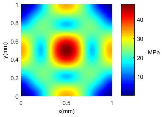 The material properties, the geometric size and the pressure value of the bottom of the silicon cup are substituted into the Equation (12), and the distribution nephogram of the stress difference of the silicon cup bottom can be obtained and shown in Figure 11.