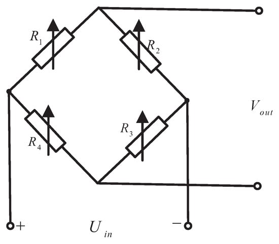 Referring to the literature [44] the four strain elements mounted in the silicon-cup bottom will constitute the Wheatstone bridge which is shown in Figure 12, according to the piezoresistive effect of silicon chip and suppose Wheatstone full arm bridge resistance as . When the strain of the strain gauge is achieved, the change rate of resistance value of the bridge arm is expressed as: