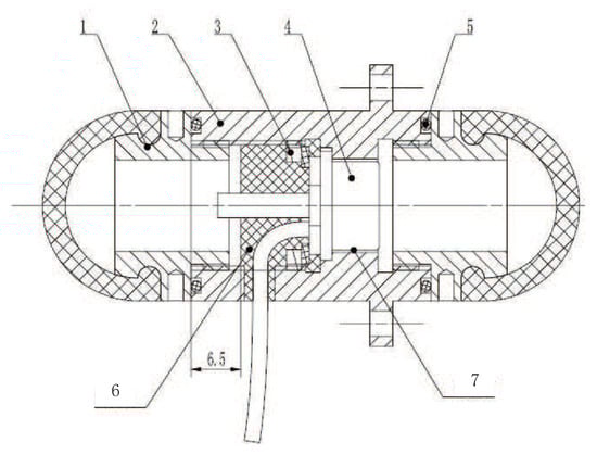 The schematic diagram of underwater UTFS assembly. (Note: 1. Flexible contact; 2. Sensor shell; 3. Snap ring; 4. Sensor core; 5. O sealing ring; 6. Epoxy Resin AB glue; 7. Glue filling cavity).