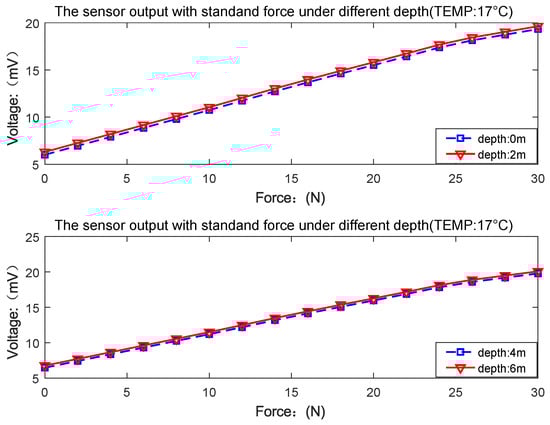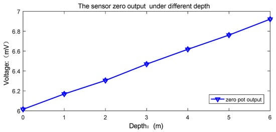 To detect the water pressure influence to the UTFS output, the zero point output experiment under different depths is realized. The UTFS is placed at different water depth ranging from 0 m to 6 m, and the output of the Wheatstone bridge is measured without any tactile force load. The zero output curves at different water depth are shown in Figure 15, which can be seen that the sensor zero point output increases linearly with water depth, from 6 mV at 0 m water depth to 6.9 mV at 6 m water depth.