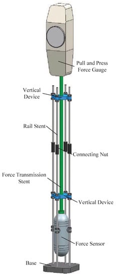 The UTFS generates interactive force for the external grasping target with the hemispherical flexible contact, and an force applying experiment under different water depth is designed for the UTFS output characteristics study. With the capacity of adjustable standard force applying and adjustable water depth supply and also adjustable temperature supply, the UTFS applying device is different from the non-underwater environment one. To realize the application of adjustable tactile force under adjustable water depth, an experimental applying device is designed as shown in Figure 16. Four rail stents are fixedly connected by a vertical device and the extremity is mounted on the base. The UTFS is installed at the end side of the rail stent through the mounting holes and is located above the base in order to achieve the maximum depth of the water environment. The force transmission stent is connected with the pull and press force gauge with the nut and thread, which achieves contact with the upper flexible contact extremity of UTFS through the vertical device to be vertical, ensures the operator apply the force on the pull and press force gauge to the UTFS in the vertical direction contact. To realize the water depth adjustment of the UTFS task environment, and the rail stent can be extended by the connection with another rail stent by the screw thread and the nut, so that the force transmission stent can also be extended with the same way. The operator can do the UTFS experiment at different water depth by operating the experimental device on the surface of the water, realizing the different depths and different tactile force supplies.