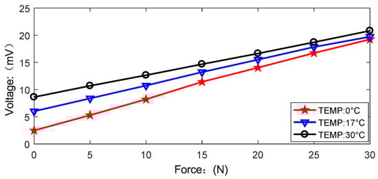 As can be seen in Figure 19 that the UTFS output is affected by the temperature, and the output with the same tactile force applying is different under different temperature environment. The maximum temperature drift occurs at the zero point, and the UTFS output is shifted from 2.48 mV to 8.63 mV when the water temperature changes from 0 C to 30 C. However, the UTFS still maintains good linearity at each fixed temperature point, and the slope of different regression linear with different temperature is different. The temperature influence can be eliminated by the temperature compensation with data-fitting algorithm [47,48].