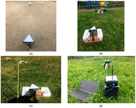 The same described method was used for each of the three frequency carriers, = 868 MHz, = 2.4 GHz and = 5.8 GHz. Pictures in Figure 2 try to illustrate the experimental scenarios of the measurement campaign.