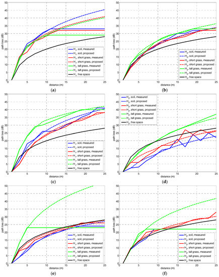 The resulting for the combination of the three types of ground coverings—soil, short grass and tall grass—, three frequency bands— = 868 MHz, = 2.4 GHz and = 5.8 GHz—and the two antenna heights— and —, are following shown in Figure 4. Results are compared to the free space path loss model. For better comparison, all the figures are depicted using the same range in the y-axis, from 0 to 50 dB.