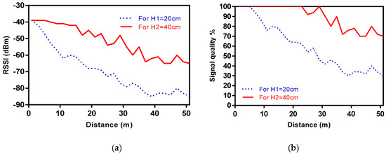 As shown in Figure 5b the link quality between the nodes improves for . At this height, the signal quality remains at 100% until 29 m. However, at the signal quality is decreasing from 5 m. When the receiver node was placed 51 m away from the transmitter the signal quality is over 70% for whilst is under 35% at the same distance for .
