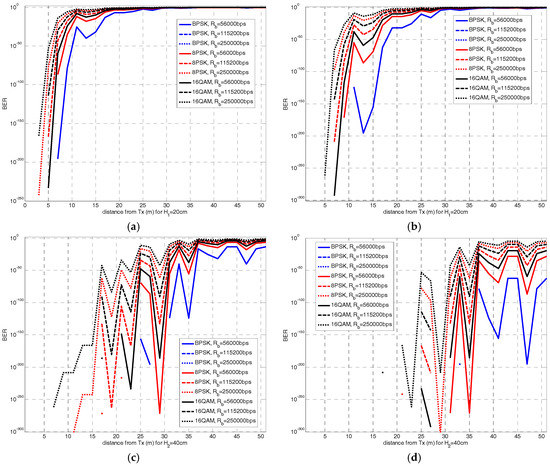 Figure 6a–d shows the calculation of BER for the two antenna heights H1 and H2 and a combination of the parameters that define BER: three values of data rate (56 Kbps, 115.2 Kbps and 250 Kbps), two values of power noise for bandwidths of B = 100 MHz (full 2.4 GHz band) and B = 20 MHz (channel bandwidth for the 2.4 GHz band), and number of symbols M (BPSK, 8PSK and 16QAM).