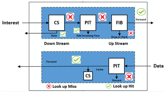 In co-reliance to FIB, PIT data structure contains all the pending IM’s which are stored in queue, waiting for corresponding data. In case of multiple Interests for the same data are received from downstream, only a leading one is sent to the upstream towards data source. PIT data structure stores IM as a PIT entry which contains the content name of the interest along with the respective interest interface. Interface contains information regarding receivers from which interest for the identical IMs is recieved. When router receives corresponsing data, it finds the corresponding PIT entry and forwards the data toward all interfaces mentioned in its PIT entry. After this, router deletes the corresponding PIT entry in the PIT and caches the data in CS. As NDN communication model is independent of the content location, so data is cached in CS to entertain future interests [27] as can be visualized in Figure 2.