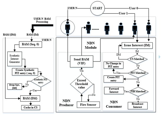 When the producer (FS) reaches the TL, the BAM (IM) generates on a dedicated seq. no. “0” in our case. Seq. no.“0” is fixed to manage fire disaster situation, it is unusable in a normal NDN-based communication between consumer and producer. Producer broadcasts the BAM (IM) to all consumers that lie within one-hop distance in the network, shown in Algorithm 1. Synthetic interest generator [26] creates a synthetic PIT entry at dedicated Seq. no. “0” location of the PIT on receiving of BAM (IM). If the synthetic PIT entry is successfully created then BAM (DM) is cache in CS for forwarding the unsolicited data on BAM (IM) response. This mechanism is used to alert all nearby consumer nodes else synthetic (IM) is discarded as shown in left block (USER N BAM processing) of Figure 4.