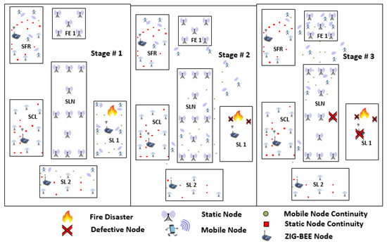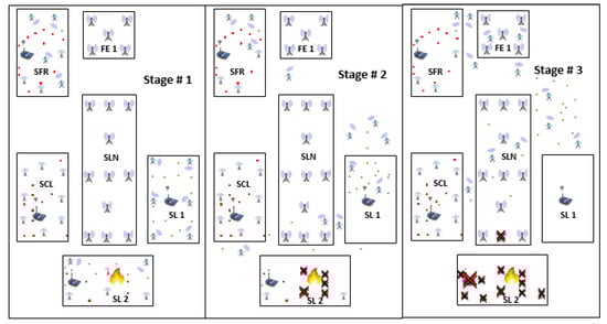 With reference to Figure 5, it demonstrates the movement of nodes when fire disaster occurs in SL-1 in a SC. Scenario: 1 is shown in three different stages i.e., stage no. 1, stage no. 2 and stage no. 3 based on the movement of the nodes at a regular time intervals. Each stage consists of five blocks represented as SL-1, SL-2, SCL, SFR, SLN, and FE-1. Every block equips with unique features with respect to a node type, nodes distribution, node and block location inside each cluster and the main arena of a SC as mentioned in Table 3. In stage no. 1, fire disaster just occurs in SL-1. In this stage, every node is fixed to its initial rest position, no movement of nodes is shown in this stage. The stage no. 2 shows the in-between state when mobile nodes move towards the FE-1. As mentioned in Section 6, SL-1 only consists of mobile nodes. Due to the mobility of nodes, there is a fewer number of nodes get affected by a fire disaster because these nodes move randomly from their initial position at a constant speed with a regular time interval. In disaster situation and on receiving the BAM, all of these mobile nodes move towards FE-1. In the last stage, almost every mobile node reaches its final destination i.e., FE-1 except few of them that are defective due to disaster.