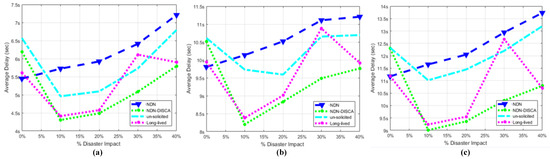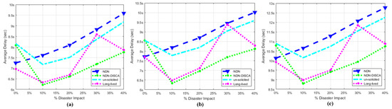 Similar rule is adopted for 30% and 40% disaster impact in both scenarios shown in Figure 7 and Figure 8. Selection of defective nodes in each block segment parameter is chosen randomly through a custom function in ndnSIM. The 0% disaster impact (i.e., normal mode) parameter in each block of Figure 7 acquire more delay than the native NDN. The existence of overhead factor in our NDN-DISCA and existing PUSH schemes mentioned in Table 4 is clearly shown in Figure 7 at 0% disaster impact. This additional overhead delay is due to the continuous monitoring of the FS value in the proposed NDN-DISCA and existing PUSH methodologies. It is not considered in native NDN. After disaster conformation such as at 10% disaster impact parameter, there are instantaneous decline-curves with respect to each scheme are shown in Figure 7 and Figure 8. These are due to the spontaneous effect of our proposed scheme NDN-DISCA and existing PUSH based models in a disaster situation, discussed in Section 4. After that the AD gradually increases with respect to disaster impact parameter. As more and more nodes becomes discarded due to disaster, the more delay we got to reach BAM to every cluster shown in Figure 7 and Figure 8. The additional payload effect due to RTO and vRTO timer effect is clearly visible in each existing PUSH schemes. At 30% disaster impact parameter, there is an instantaneous change in long-lived PUSH scheme in a smooth path as shown in Figure 7 and Figure 8. It is the expiry of vRTO timer effect which needs the re-transmission of packets for calculation of parameter in the long-lived interest scheme. It ultimately results in additional AD in overall SC. We used the constant parameter in long-lived interest scheme in our scenario. This configuration setup is used for better visualization of vRTO timer effect at 30% disaster impact, shown in Figure 7 and Figure 8 respectively. These sudden delaying effect is not affordable in DMS. As critical information is propagated from one cluster to another cluster, we need a smooth flow of information propagation between nodes for effective response. Moreover, our proposed scheme NDN-DISCA becomes more effective, suitable and robust than legacy NDN and existing PUSH based communication schemes in a disaster environment. Delay is reduced by a margin by implementing our proposed methodology NDN-DISCA. It is also evident in Figure 7 that shows the clear benefit of using the light version of PUSH support in IoT environment for disaster detection i.e., NDN-DISCA. Similarly, in scenario 2, the same nature of results are evaluated after analysis as compared to legacy NDN and existing PUSH schemes as shown in Figure 8 and Equatin (1). The major difference between two scenarios is the delay range on the y-axis that is obvious due to the difference in scenario setup as discussed in Section 5. In addition, Figure 7 and Figure 8 also shows that mobile nodes require less time to propagate BAM and become more reliable due to its mobility feature than barely static nodes.
