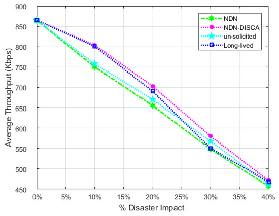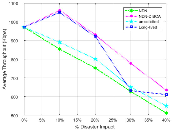 On 0% disaster impact, the proposed scheme NDN-DISCA, legacy NDN and existing PUSH schemes have the same overall throughput. The unusual behavior at 0% disaster impact represent disaster free scenario at which our proposed scheme NDN-DISCA and comparable PUSH models operates in a normal mode. There is no additional overheard factor included in a throughput calculation for FS status monitoring as in AD. It is due to the fact that FS value monitoring doesn’t affect the throughput factor it only considers in AD of NDN nodes. Once the disaster is detected there are sharp peaks of NDN-DISCA and long-lived schemes prominent at 10% disaster impact in both scenarios. It is more clearly visible in scenario: 2 shown in Figure 10. It is due to the rapid transmission of bulk of critical information in the form of BAM between different clusters mentioned in Section 6 in our proposed scheme NDN-DISCA and existing long-lived interest PUSH model. Moreover at 30% disaster impact, there is a sharp decline in a throughput curve with respect to long-lived PUSH scheme which highlights the vRTO timer effect on SC. Once the vRTO timer resumes, the throughput parameter again increases and goes back on a smooth path. This process continues for N no. of nodes in a SC. Furthermore, with the increase in disaster impact parameter more number of nodes get discarded due to disaster. In response throughput becomes decrease gradually as shown in Figure 9 and Figure 10. Scenario: 1 is less affected by the throughput parameter in a disaster situation as compared to legacy NDN and existing PUSH schemes. It is due to the presence of only mobile nodes in SL-1. As mobile nodes move randomly inside and outside the cluster, it is very difficult to acquire all bits in the NDN nodes every time. Speed mobility is also one of the controlling parameter in mobile nodes, which will address in the future work of this research. Our proposed scheme NDN-DISCA excel legacy NDN scheme and existing PUSH schemes significantly with respect to throughput metric in both scenarios. It can also be proved theoretically in Section 4 and numerically through Equatin (2). It also states that less number of bits become discarded due to unreachable towards CS, PIT, and FIB data structure of nodes as compared to legacy NDN and existing PUSH mechanism. In NDN-DISCA, seq no. `0’ is fixed only for handling disaster situation, so BAM is generated according to seq no. `0’ PIT location only. On the other hand in legacy NDN, interest packet is generated according to consumer demand on various seq. no’s. Further, in existing PUSH schmes RTO and vRTO timer factor minimize the overall throughput in the IoT environment for disaster detection as shown in Figure 9 and Figure 10. The throughput of scenario: 2 also depicted similar nature of results as in scenario: 1. The prominent factor to be noted, there is a wide range of gap between NDN-DISCA ,NDN and PUSH schemes throughput curves. It further clarifies the effect of hybrid nodes distribution in scenario: 2. As static nodes are stick to its initial location, so there is less probability to discard bits while receiving in the NDN nodes. It increases the overall throughput parameter in the proposed DMS NDN-DISCA. It can also be clearly visualize the effectiveness of NDN-DISCA on NDN and existing PUSH schemes as shown in Figure 10.