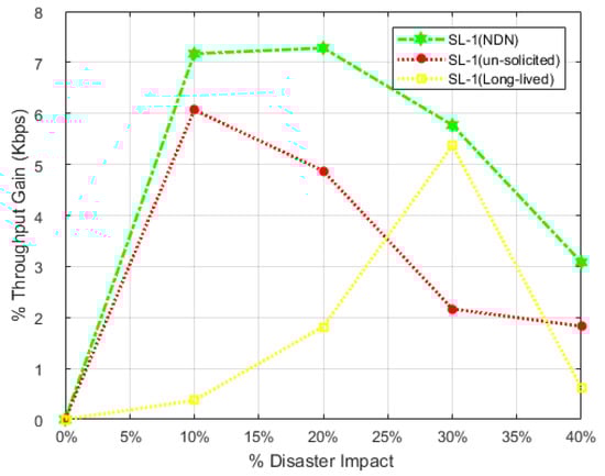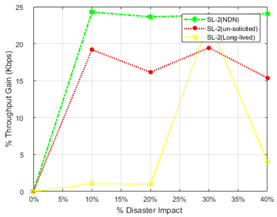 This factor evaluates the overall gain in throughput with respect to native NDN and existing PUSH schemes in both scenarios: 1 and scenario: 2 individually. The effectiveness of NDN-DISCA in the light of throughput parameter is shown in Figure 9 and Figure 10, along with Section 7.2. Figure 11 shows the throughput gain difference with respect to SL-1, while Figure 12 refers to SL-2. These graphs further clarifies the above discussion regarding the effectiveness of throughput parameter in different scenarios in the case of SC. It also emphasizes how hybrid nodes play their role in overall NDN-DISCA in case of throughput gain in disaster environment. As discussed in Section 7.2, SL-1 is become less affected by %ATH as compared to legacy NDN and available PUSH schemes architecture than SL-2. In a disaster situation, scenario: 1 %THG curves in each scheme is lower than the scenario: 2 %THG curves shown in Figure 11 and Figure 12. These multiple curves shows the clear visualization of gain between proposed NDN-DISCA and existing PUSH schemes along with native NDN in each scenario respectively. In Figure 11 and Figure 12 the RTO and vRTO timer effect becomes more visible in the form of sharp peaks. Specially, at 30% disaster impact in long-lived interest PUSH scheme in both scenarios, it becomes more prompt and visible as discussed in Section 7.2. These results are also proved numerically through Equatin (4) and theoretically in Section 5 and Section 7.2.