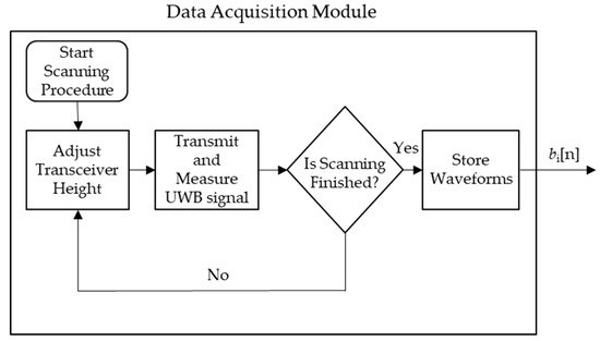 Figure 2 shows the procedure used in simulated and experimental trials to measure the UWB signals used to produce root images. The procedure produces a set of temporal scans, , where and where is the total number of scans. refers to the waveform measured when the transceiver is positioned closest to the surface of the soil, and refers to the waveform measured when the transceiver is positioned closest to the bottom of soil.