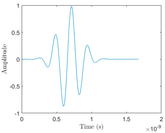 and contains most of its energy between 3.1 GHz and 5.3 GHz. Figure 4 shows the waveform, , produced by Equation (1).
