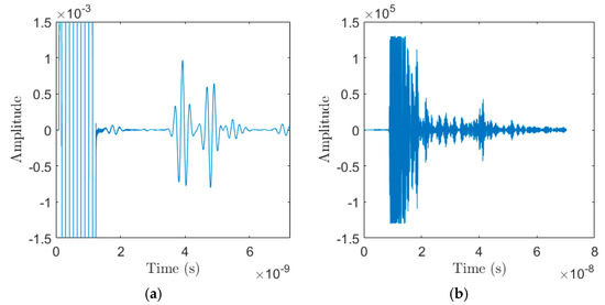 As seen in Figure 6b, there was significant noise in the measured signals caused by the hardware in the first 15 ns of the captured waveform [34]. Since the noise was consistent in terms of amplitude and temporal location, the Wiener filter estimated the noise on the assumption that the rest of the signal consisted of only additive random processes. Figure 10 shows the general block diagram for the process to remove the hardware noise.