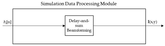 The Data Acquisition Module produces a set of reflected waveforms . The peak energy occurrences in each waveform correlate to approximate distances from transceiver to reflecting material. Delay-and-sum (DAS) beamforming forms an image based on known physical and electrical parameters using , and is the primary data processing method for creating a 2D spatial image using 1D temporal data. DAS was chosen over other beamforming algorithms due to its success in other imaging studies utilizing UWB systems [26,28,29]. The simulated results were designed to be absent of noise and required no preprocessing before the delay-and-sum beamforming algorithm, as shown in Figure 8. For the experimental trials, the collected data required some pre-processing to remove noise caused by the apparatus as shown in Figure 9. The details of the additional noise removal is outlined in Section 2.3.1. The details of the DAS beamforming algorithm is outlined in Section 2.3.2.