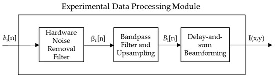 With the selected physical parameters, the region of interest lay at around the 12 ns–13 ns for calculating the DAS beamforming image. Unfortunately, this portion was in an area with large amounts of noise caused by the hardware in the P410 [34]. This hardware noise was dealt with by using the procedure outlined in Section 2.3.1.