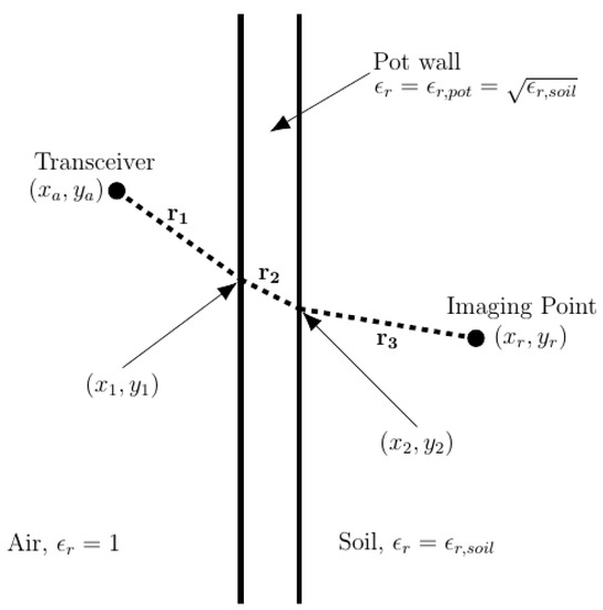 Figure 12 shows the vectors , and that determines the most direct path that a wave can travel from transceiver to imaging point. The values are known, and are not known. To determine the magnitudes of the vectors , , and , we must first find and . Using and Snell’s law, we can solve for and using the following equations: