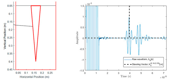 In particular, we need to first determine the steering vector for at the imaging point , i.e., we are calculating . We can overlay the steering vector with the waveform by flipping the steering vector about and plotting both. Figure 13 shows that the calculated steering vector lies within one of the measured reflections. This is logical because Figure 13 shows that the chosen imaging point, , is very close to the surface of the root which is causing high energy reflections.