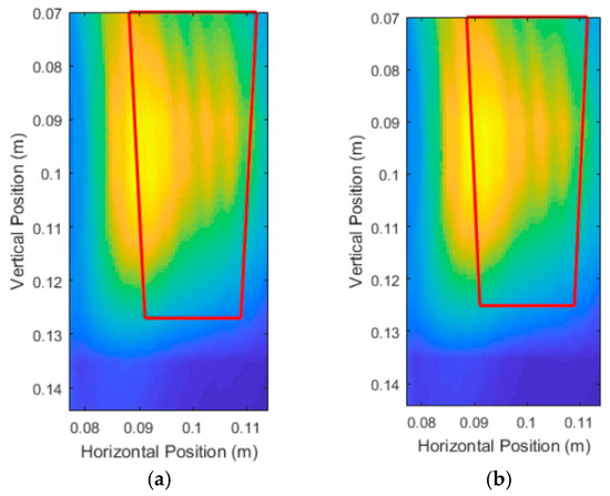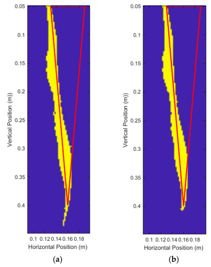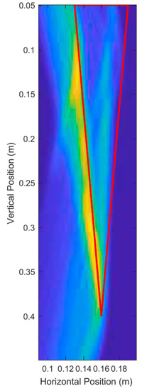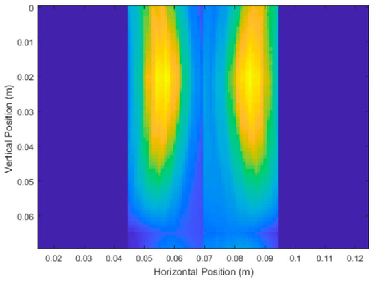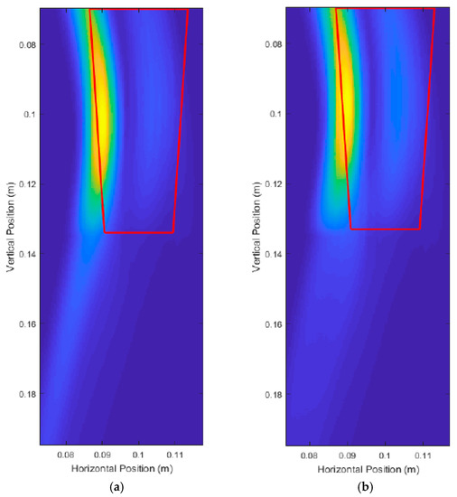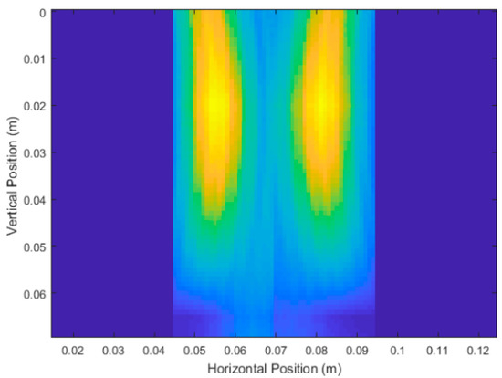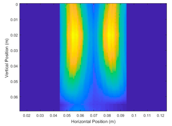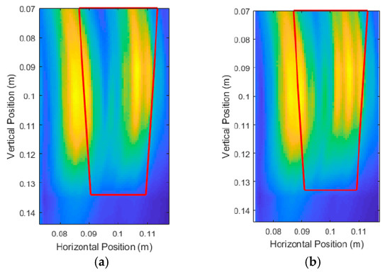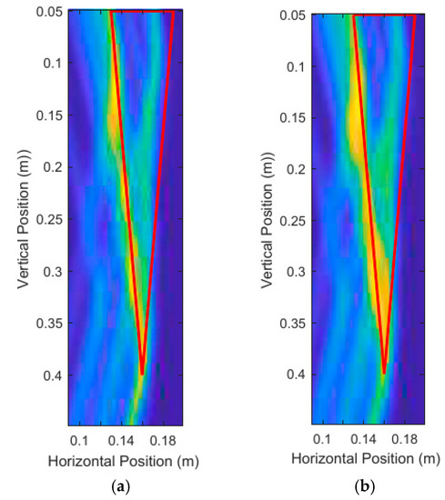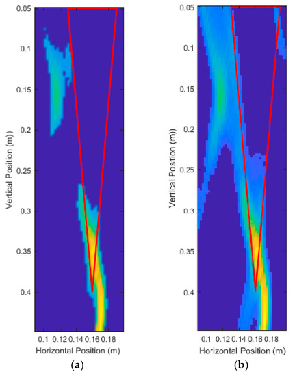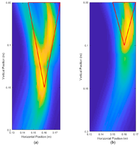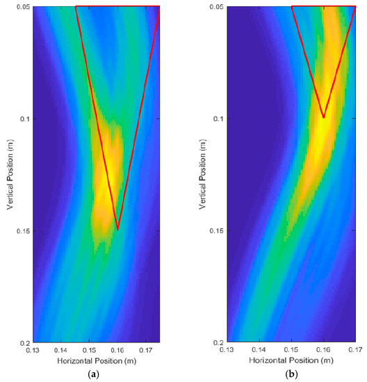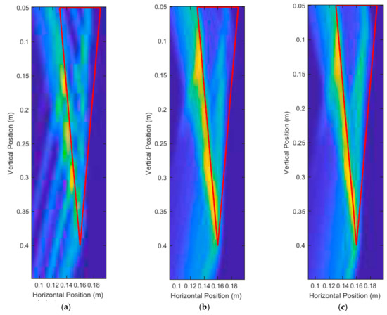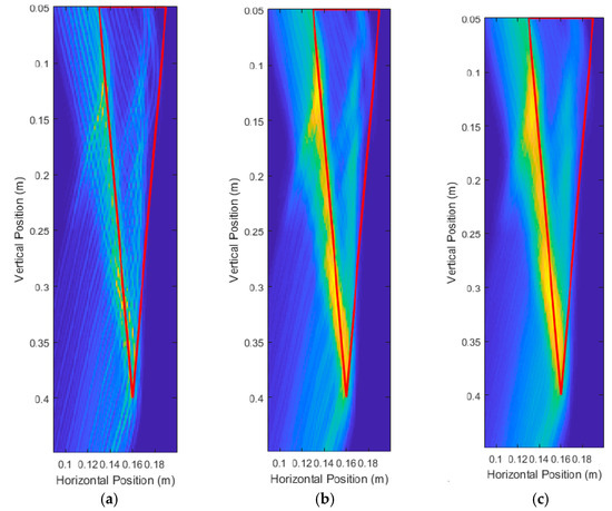 The weighting value is a scalar value from 0 to 1. The value is determined by how close the position of the transceiver is to the imaging point. The closer the position, the closer the value of is to 1 for that scan number and imaging point. This places emphasis on the scans closer to the imaging point to reduce the effect of potential multipath issues. Emphasis is placed on the positions with the shortest direct wave paths to the imaging point. Equation (12) is the equation used for determining all the values for .