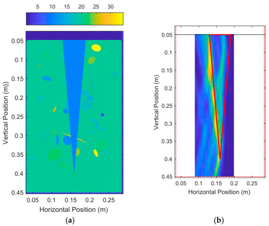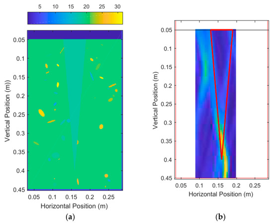 If and in Equation (13) are changed to the vectors and corresponding to a spatial grid in the Cartesian coordinate system, then is rewritten as a matrix and is the unprocessed DAS beamforming image for this particular set of scans. Careful design of vectors and is done to exploit known knowledge of the root to reduce noise in the image and to reduce the time it takes to create an image. For example, if it is physically observed that the stem of a canola plant right at the surface of the soil exists 3 cm from the pot, then it is likely that the root should be around 3 cm from the pot. and can be selected so that it images the region around 3 cm from the pot wall in this case, ignoring regions that may be too far from the stem location of the plant.