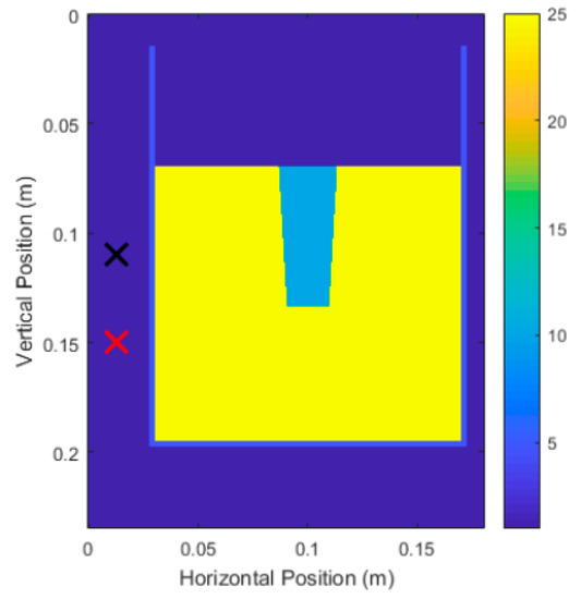 Figure 30 shows an example of the physical and electrical parameters of the system under test for simulating Carrot 1, Side 1 from the experimental trials. is selected and is selected. The soil relative permittivity was selected using trial and error to yield the best measurements, and the selected value aligns with the higher end of the relative permittivity found in literature for dry soils [32,39]. The root relative permittivity was selected to provide adequate contrast between root and soil. The transmitter and receiver are separated by 4 cm to simulate the bi-static set-up of the P410 antenna. The height used for the DAS beamforming algorithm was the height of the transmitter for the experimental trials. The top marked ‘x’ was the transmitter location while the bottom marked ‘x’ is the receiver location. The transmitter and receiver were positioned 1.5 cm from the surface of the pot. 10 scan positions were made, starting at 2 cm depth from the soil and ending at 11 cm depth. The root itself was modeled by taking the diameter at the top and diameter at the bottom, and linearly interpolating the shape of the root in between top and bottom.