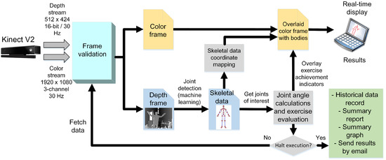 Then, an overlay color image with skeletal data and performance scores was displayed in real-time on a computer screen. The correspondence between joint coordinates and pixels from the RGB image was obtained with a mapping procedure. The execution can be halted at any moment and reports then automatically generated. The implemented methodology follows the flowchart of Figure 1.