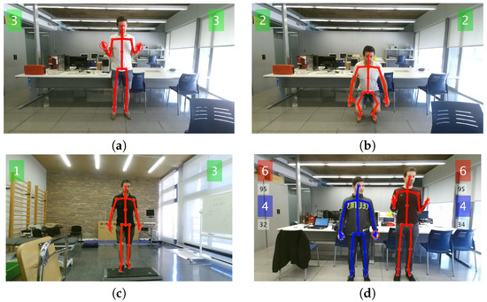 The pseudocodes for each exercise: elbow/knee flexion (squat), step climb and balance are summarized in Algorithms 1–3, respectively. The number of accomplished exercises (i.e., the variable flexCount) was displayed on the computer screen for each player, and if desired, the real-time measured angle of the joint of interest could be displayed, as well. Angles were measured by Kinect V2 without any filtering. The only preprocessing done was: (i) discarding the measurement if no bodies were detected or if joints of interest were flagged with the ‘NotTracked’ status and (ii) clipping the 2D joint positions that fell outside the RGB frame. An example screenshot for each exercise is shown in Figure 2, including a sample capture of the two-player mode.