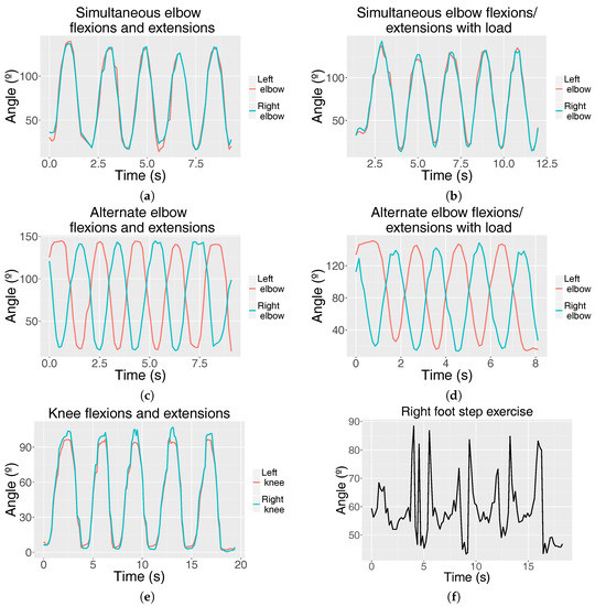 Graphs representing the joint angle (°) fluctuation of different exercises over time (s): simultaneous elbow flexions and extensions (a) without load and (b) with load; alternate elbow flexions and extensions (c) without load and (d) with load; (e) knee flexions and extensions (squats) and (f) right ankle angle fluctuation when performing four right-foot step climbs and descents.