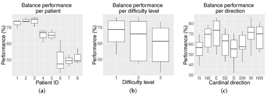Figure 5a shows that each participant obtained a different balance performance. Three patients presented an average performance below 50%, two patients a performance close to 65% and the remaining three patients close to 75%. As expected, Figure 5b shows that the balance performance decreased as the difficulty level increased. Kruskal–Wallis analysis revealed that there were significant differences among the levels of difficulty (p-value = 0.013). Multiple comparisons find differences (p-value = 0.010) between the performance at Level 1 (median = 68.50 and interquartile range = [58.00–76.00]) and at Level 3 (60.00 [46.25–71.75]. However, no significant differences were found between Level 2 (65.50 [51.00–73.75]) and Level 1 or between Level 2 and Level 3.