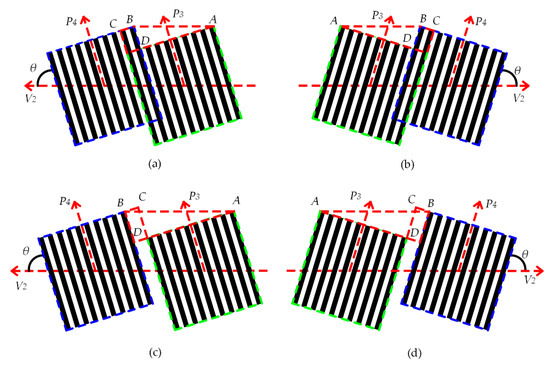 Several grating images obtained at different angles: (a) Leaning to the left and overlap phenomenon, overlap value is −BC/sinθ (b) Leaning to the right and overlap phenomenon, overlap value is −BC/sinθ (c) Leaning to the left, and the interval distance value is BC/sinθ (d) Leaning to the right, and the interval distance value is BC/sinθ.
