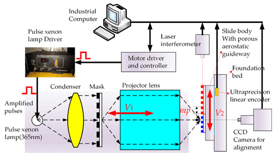 Figure 6 illustrates the schematic of the experimental setup. The grating lithography alignment system includes a lithography lens, CCD camera for alignment, foundation bed with ultraprecision, side body with porous aerostatic guideway, laser interferometer (Renishaw XL80), and pulse xenon lamp driver, and industrial computer system.