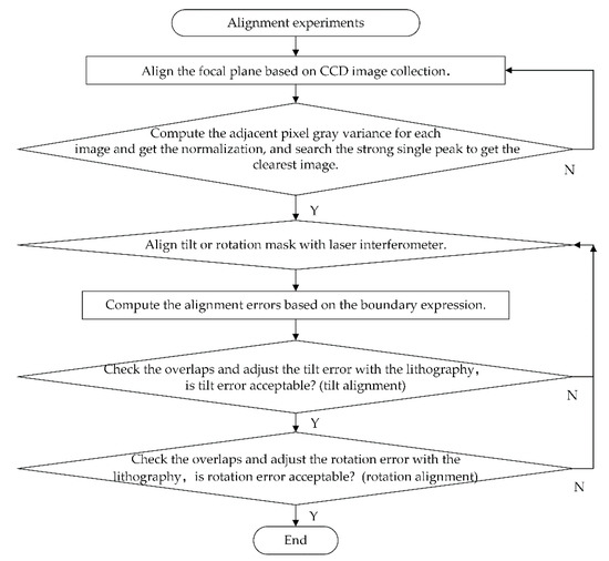 Figure 7 shows the flowchart of the alignment experiments, where the tilt error and rotation error are eliminated by the algorithm and lithography experiment platform. First, the focal plane is aligned by collecting the CCD images and searching the strong single peak to obtain the clearest image. For such an image, the adjacent pixel gray variance is computed and normalization is realized. Moreover, the mechanism motion precision and CCD resolution determine the alignment error of the focal plane. Second, the align tilt or rotation errors with the laser interferometer, in which the tilt errors including the docking error are accumulated by the whole linear scale and BD error mentioned in Section 2.2, will be eliminated by calibrating the system projection dimension precision and adjusting the projection tilt error. Moreover, the rotation errors directly affect the pitch accuracy, which could be eliminated by the boundary expression and weight function of the alignment function. Moreover, it is also associated with the adjustment of the tilt error, and the same steps are repeated to reduce the error by multiple times, thereby achieving the desired results.