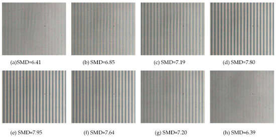 The fundamental principle of projection lithography alignment for high-precision linear scale is illustrated in Figure 1. First, focal length of the CCD sensor is adjusted so that it is aligned with the grating focal plane. Second, the custom mask plate is mounted on the projection lithography lens system, the spatial position of the lithography lens is adjusted, and it is ensured that the focal length is aligned with the grating focal plane by monitoring the clarity of the CCD image. For the latter, the tilt adjustment method and sharpness algorithm are two important points for achieving alignment. In the next step, the installation mask tilt is adjusted based on the direction of movement of the table, and then the Abbe principle is complied with to align the dual-frequency laser interferometer movement direction and workbench movement in the same direction to ensure that the base surface of the grating and dual-frequency laser interferometer optical path are in a straight line. Simultaneously, the rotation mounting error is adjusted based on a specific algorithm. Finally, precision alignment is achieved by calculating and comparing the gray values of the mask projection image, such as a single pitch and the full width of multiple pitches.
