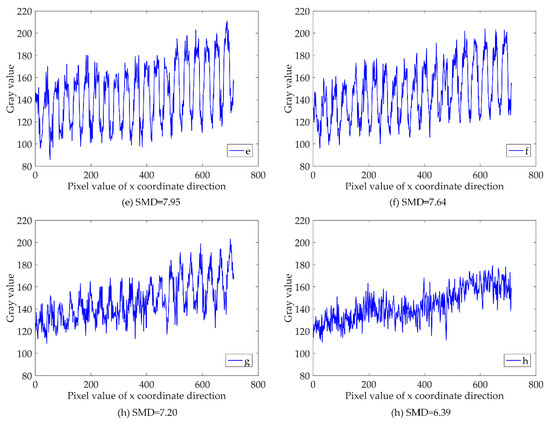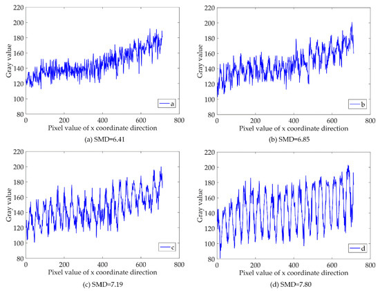 Figure 9 presents the extracted X[1, m] of the image curve of the gray value using MATLAB software. The clearest picture is identified by assessing the trend curve. The image shows that the grating strips are vertical and horizontal, showing the distribution of the lightness and darkness. The trend displayed by the gray values of each row in the image is the same, and for the evaluation resolution data selection, the first row of the array is simply chosen as a representative value.