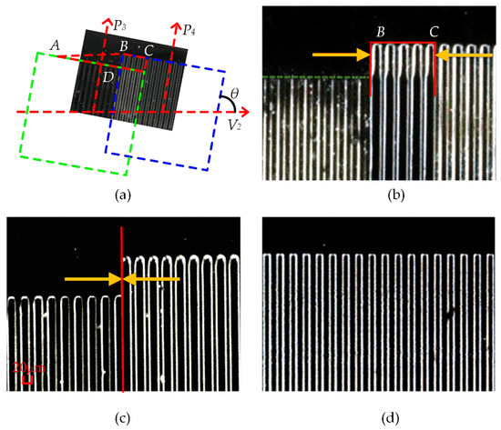 As shown in Figure 11a, is the first photolithographic position, moving through the control system and laser feedback system in the direction by 4.800 mm, reaching position and performing the photolithography, and applying the photolithography process for development. Three corrections, as included in Figure 11b,c, are performed based on the photolithography test to obtain the result shown in Figure 11d. By performing the focusing process in the above flow chart, the BC value is reduced to reach the error range and the alignment method is verified.