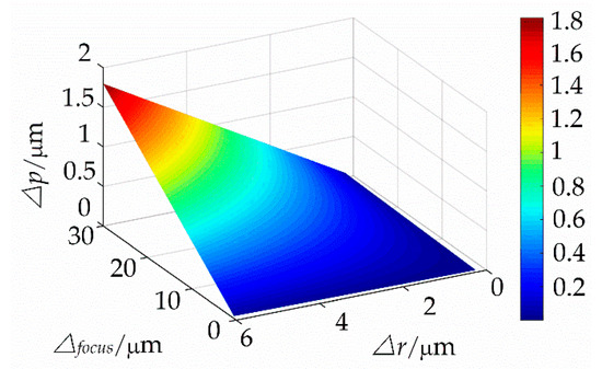 The lithography precision alignment error discussed in this section is mainly for the static case, i.e., before the lithography process, a full-length static calibration of multiple points is conducted to achieve the focal length alignment. In contrast, in the grating lithography process, the main factors that affect the focal length alignment error include the movement straightness of the guideway direction, clamping error of the blank grating, and vibration of the moving process, which cause the deviation in the overlap of the focal plane and photoresist plane of the blank grating. For the static case, the relationship between the focal plane deviation and offset deviation of the lithography pitch is expressed in Equation (19) and depicted in Figure 12.