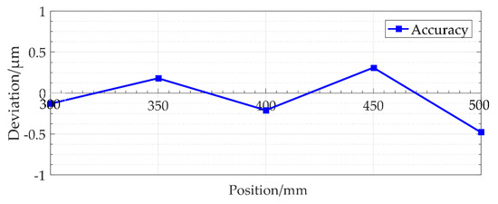 In the experimental verification, when the tilt angle is aligned as discussed previously in Section 4.2, consideration of the uncertain factors and laser displacement sensor pitch alignment yields a CCD maximum resolution pixel of 0.1 μm while reducing the effect of the other parameter factors. As shown in Figure 13, the accuracy of the scale is 0.79 μm in only a 200-mm-measurement range.