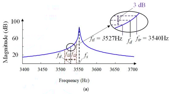 The amplitude-frequency and phase-frequency responses of the sense-mode open-loop function E(s) are shown in Figure 5. The peak gain of the amplitude-frequency response at the sense-mode resonant frequency reaches 84.4 dB because of the high Q of the sense mode. Nevertheless, when the external angular rate with frequency fΩ applies to the MCVG, fΩ is modulated to a two-side band fd − fΩ and fd + fΩ with the drive-mode resonant frequency fd of 3535 Hz as the center point, as shown in the detail view; −3 dB bandwidth of the angular rate response is only 13 Hz because of the high Q.