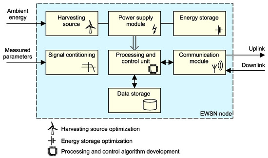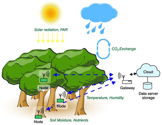 Environmental wireless sensor networks (EWSNs) are typically used to obtain information about environments that is needed for decision making. In this context, “environmental monitoring” may refer to observation of indoor or outdoor spaces, whether natural or man-made. Relevant approaches include remote sensing using aircraft and satellites, laboratory analysis of field-collected samples, and in-situ monitoring using sensor devices and networks. They monitor chemical, biological or population-related parameters of the environments under surveillance [1]. As an example, Figure 1 illustrates a suite of variables monitored in the context of terrestrial ecosystems. Such environments represent a wide range of environmental energy regimes, from rainy seasons in tropical rain-forests to polar nights in Arctic deserts.