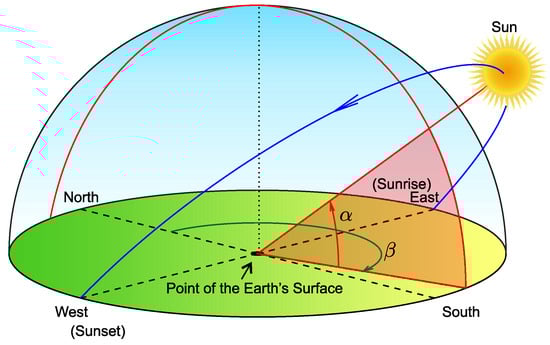 Correct position of the solar panel is important to achieve its maximum possible efficiency. As shown in Figure 2, the location of the sun in the sky relative to a location on the surface of the Earth can be defined by the solar altitude (the angle between sun’s position and the horizontal plane of the Earth’s surface) and by the solar azimuth (the angle between a vertical plane incorporating the solar disk and a line running due north) [15].