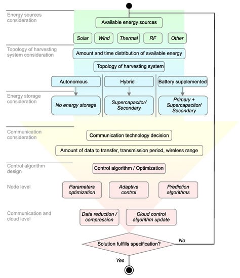 Autonomous harvesting systems fully satisfy their energy needs from ambient sources, without batteries [74,75]. Autonomous systems can only operate when the energy source is available, but their lifetime and performance are not limited by storage inefficiencies (e.g., round-trip efficiency, self-discharge, and aging). These systems are inherently governed by the so-called energy neutrality principle, since they can never consume more energy than their harvesting device can deliver. They must be designed for maximum performance (i.e., to perform at the maximum level that can be supported in a given harvesting environment) [72]. To support these design goals, autonomous harvesting systems should employ prediction algorithms that give estimates of future available energy over time [76]. A proper energy management strategy should allow such a system to achieve the desired utility within a variable energy environment [67].