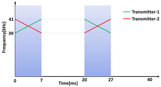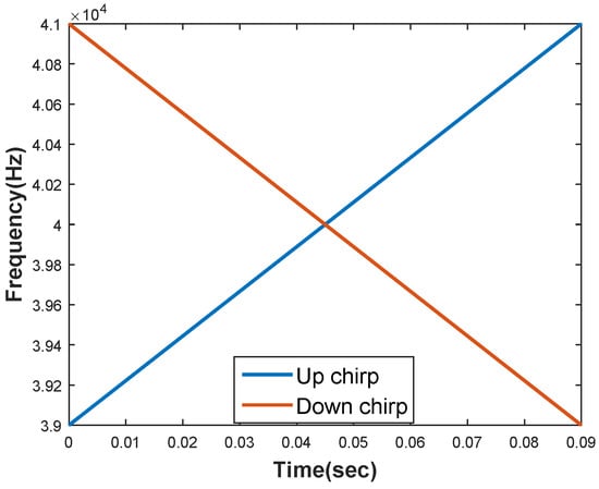 Illustration of up and down chirp rates for two signals with 39–41 kHz/9 ms and 41–39 kHz/9 ms chirp signals.