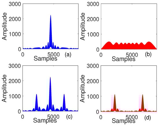 In frequency domain, this operation corresponds to zero interleaving Discrete Fourier Transform (DFT) of to obtain frequency domain equivalent of and shifting the frequency domain equivalent of by one position to the right to get the frequency domain equivalent of []. Although both signals, and are transmitted simultaneously from different transmitters, both signals are received by receiver without any interference as the multiplication of the frequency spectra of both results in zero. The auto correlation of , cross-correlation of and , auto correlation of and cross-correlation of and and are provided in Figure 2.