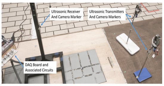 Time of flight-based ultrasonic positioning systems can be cost-effective alternatives for long-term motion tracking in rehabilitation clinics and gait analysis []. The gold standard for clinical gait analysis is the optical motion capture system with multiple high-speed cameras [] which is costly, sensitive to variations in the light intensity, clutter and shadow. It also requires dedicated laboratories, experienced operators and complex calibration procedures []. Motion capture systems such as Vicon MX—with more than 6 cameras which provide sub-millimeter accuracy cost tens of thousand dollars []. Motion tracking systems employing micro-electromechanical sensors such as accelerometers and gyroscopes cannot be used for reliable long-term tracking due to pronounced drift []. Systems employing more than one type of sensors to complement the performance of each other such as the systems explained in [,,,] increased the overall cost and complexity of the system. Ultrawideband (UWB) systems can also be used for time of flight-based localization. However, accurate clock synchronization between the mobile nodes is difficult due to the high propagation speed of the UWB waves. The cost of the system also increases as the receivers need an analogue to digital converters which can sample signals with high bandwidth [].