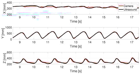 The comparison of the 3D coordinates of one marker attached to one of the lower limbs extracted from the proposed ultrasonic system and motion capture system for a walking speed of 0.83 m/s.