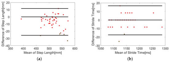 The Bland-Altman plots [] depicting the difference between the gait parameters extracted from both systems are shown in Figure 10. The upper and lower limits of agreement were mean difference ± 2× standard deviation (SD) of the difference. The plots show an agreement between both the systems with small limits of agreement. The least count for representation of temporal parameters in the plots was 8 ms as the sampling rate of the reference system was 120 Hz, which was found to be about 0.6% of the average stride time and can be neglected.