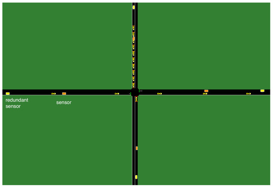 Each intersection in the 3-by-3 grid. For illustration, a critical and a redundant sensor are shown in the figure. For each lane, a second redundant sensor is placed with twice as much distance as the distance between the first redundant sensor and the critical sensor. All 8 total redundant sensors are used to predict the value of a sensor.