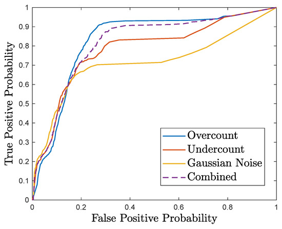 To generate the trade-off curve, first, we simulate the anomalies on the test data, and evaluate the performance of the detector by counting the number of true positives and false negatives. Similarly, we simulate the system under normal operation and evaluate the performance of the detector to obtain the number of true negatives and false positives. We repeat the steps while varying the detection threshold in order to obtain the trade-off curve (i.e., true positive probability as a function of false positive probability). Figure 6 shows the resulting trade-off curve.
